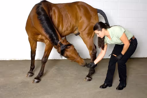 Horse performing a baited stretch. Note muscle activation on the abdominal wall and around the stifle.