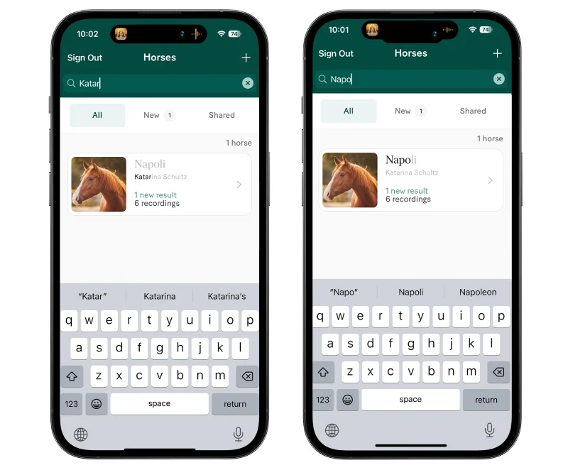 Searching is now a breeze. Whether it's a horse or client you're looking for, just type the name in the search bar, and you'll find it.