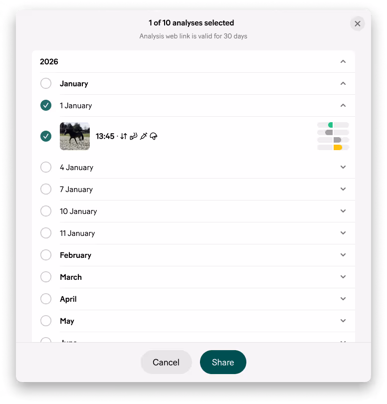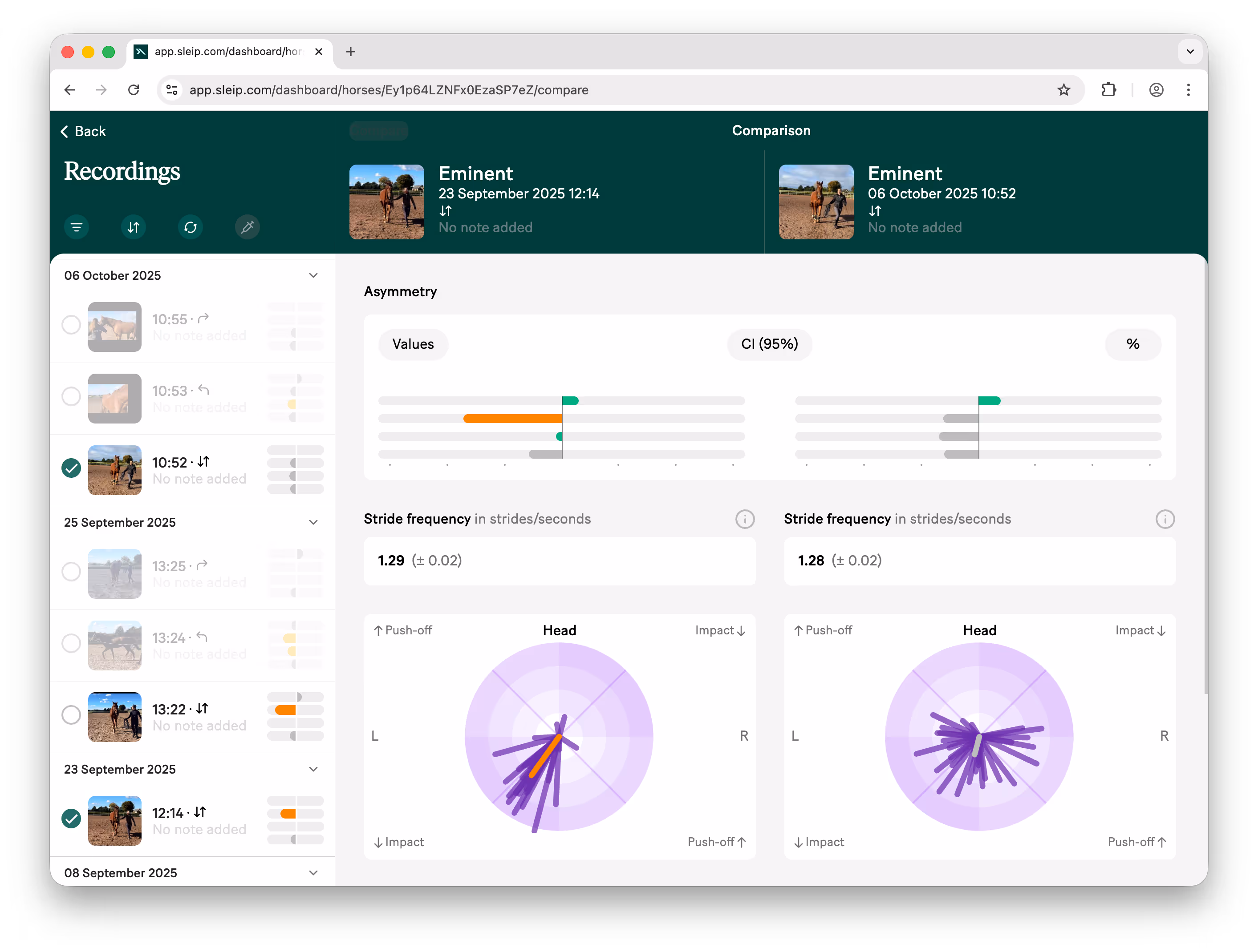 Create permanent Sleip links to individual analyses or horses for inclusion in your clinic’s digital records or medical journals. You can also download analysis or original videos for presentations, archives, or referral communication — keeping all information stored and traceable in your clinic workflow.