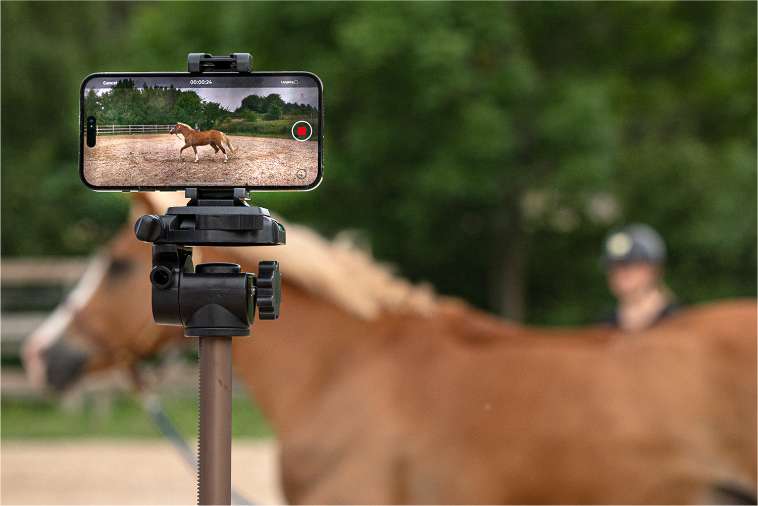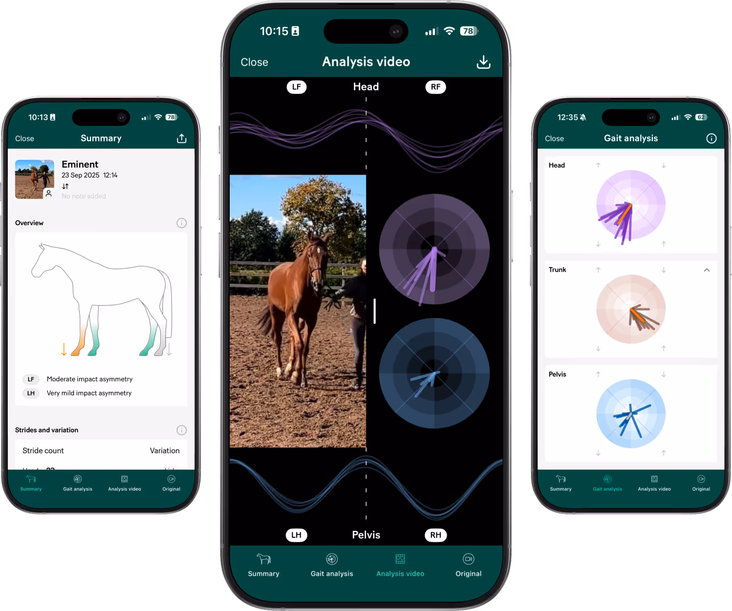 Record a horse trotting straight toward and away from the camera, or on a left and right longeing circle, to analyse gait. Once the recording is complete, you can view both the original video and an analysis video with real-time measurements.